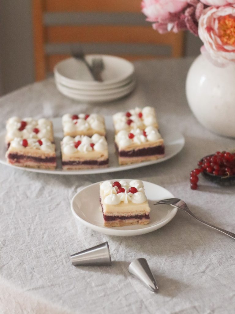 Kolač s višnjama ohladite u hladnjaku pet sati. Dobro ohlađeni kolač lagano nožem odvojite od bočnih stranica kalupa te ih pažljivo skinite. Kolač režite na kocke, nakon rezanja po želji ukrasite tučenim mliječnim vrhnjem za šlag, ja sam po vrhu dodala još koju bobicu crvenoga ribizla.