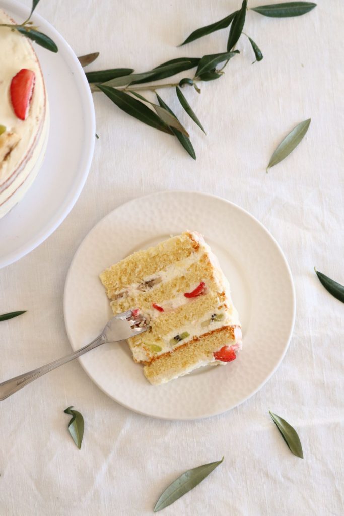 Bananu i kivije ogulite te narežite na ploške debljine 0,5 cm. Jagode operite, skinite im peteljku te također narežite na ploške jednake debljine. Narezano voće pokapajte sa sokom polovice limuna kako ne bi potamnilo te ga posušite papirnatim ubrusima. Voće treba dobro posušiti kako ne bi pustilo tekućinu tijekom slaganja torte i tako razrijedilo kremu. Pri slaganju torte svaku koru premažite šećernim sirupom jer je genoise biskvit lagan, ali zahtijeva dodatnu vlažnost i mnogo kreme. Kore bi tijekom premazivanja sirupom trebale postati nijansu tamnije, a pod prstom biste trebali osjetiti promjenu u vlažnosti biskvita. Kremu sam nanijela slastičarskom vrećicom, kojoj sam škarama odrezala vrh (promjer 2,5 cm), a zatim ju lagano špatulom poravnala. Takav način nanošenja kreme pokazao mi se urednijim i jednostavnijim jer ne bude mrvica biskvita u kremi.